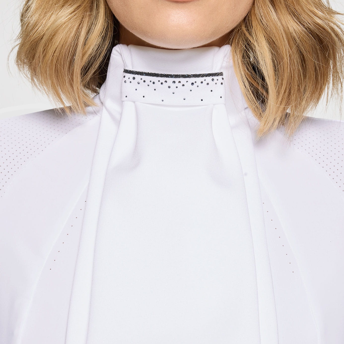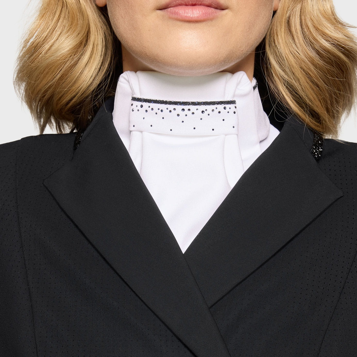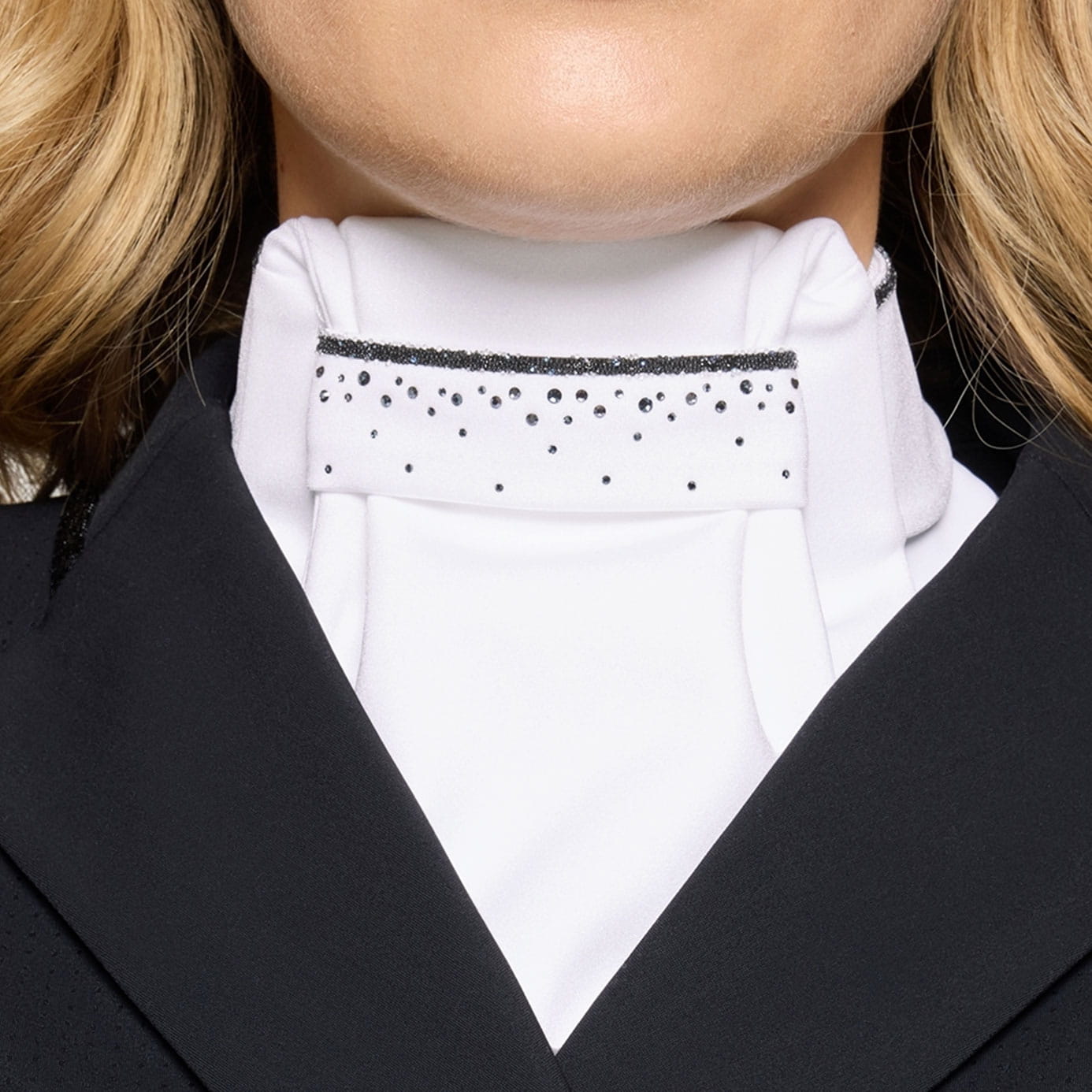 The Samshield Crystal Fabric Stock in White with Summer Nights brings refined luminosity to your dressage look, balancing classic elegance with modern sparkle.