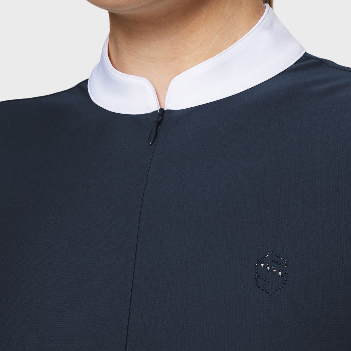 A discreet invisible front zip preserves the clean lines of the design, while a tone-on-tone Swarovski® crystal Samshield blazon on the left chest provides an elegant hint of shimmer.