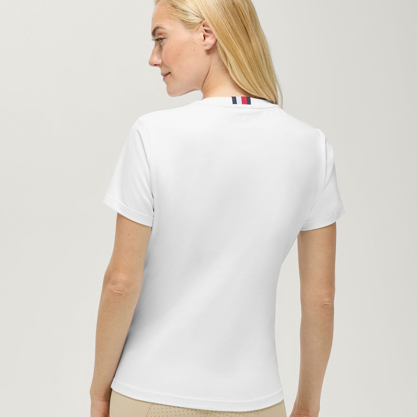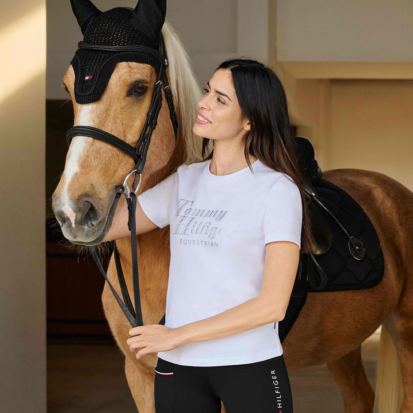 Add a touch of sparkle to your summer wardrobe with the Tommy Hilfiger Malibu Rhinestone T-Shirt in Optic White, a versatile piece that transitions effortlessly from equestrian wear to everyday styling.