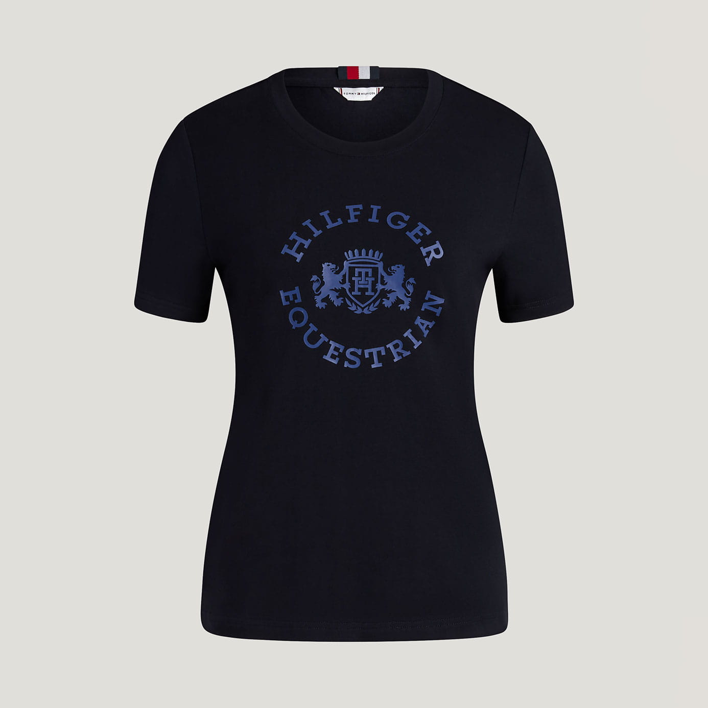 A contrast indigo blue, crest-style printed Tommy Hilfiger logo sits proudly on the chest, adding a heritage-inspired focal point.